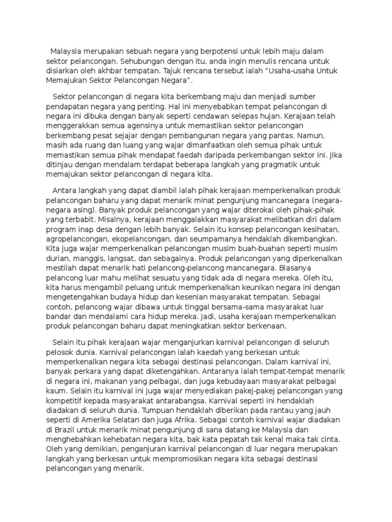 Sebagai contohnya Kementeria Pelancongan telah mengadakan pelbagai pertunjukan kebudayaan dan destinasi pelancongan Malaysia ke beberapa buah negara sebagai usaha mempromosikan Malaysia kepada. Post Penting bagi Pelajar SPM. CONTOH KARANGAN SPM LANGKAH-LANGKAH MEMAJUKAN INDUSTRI PELANCONGAN DESA NEGARA Sedasawarsa ini pelancongan desa merupakan industri perkhidmatan yang kian berkembang pesat di negara kita.